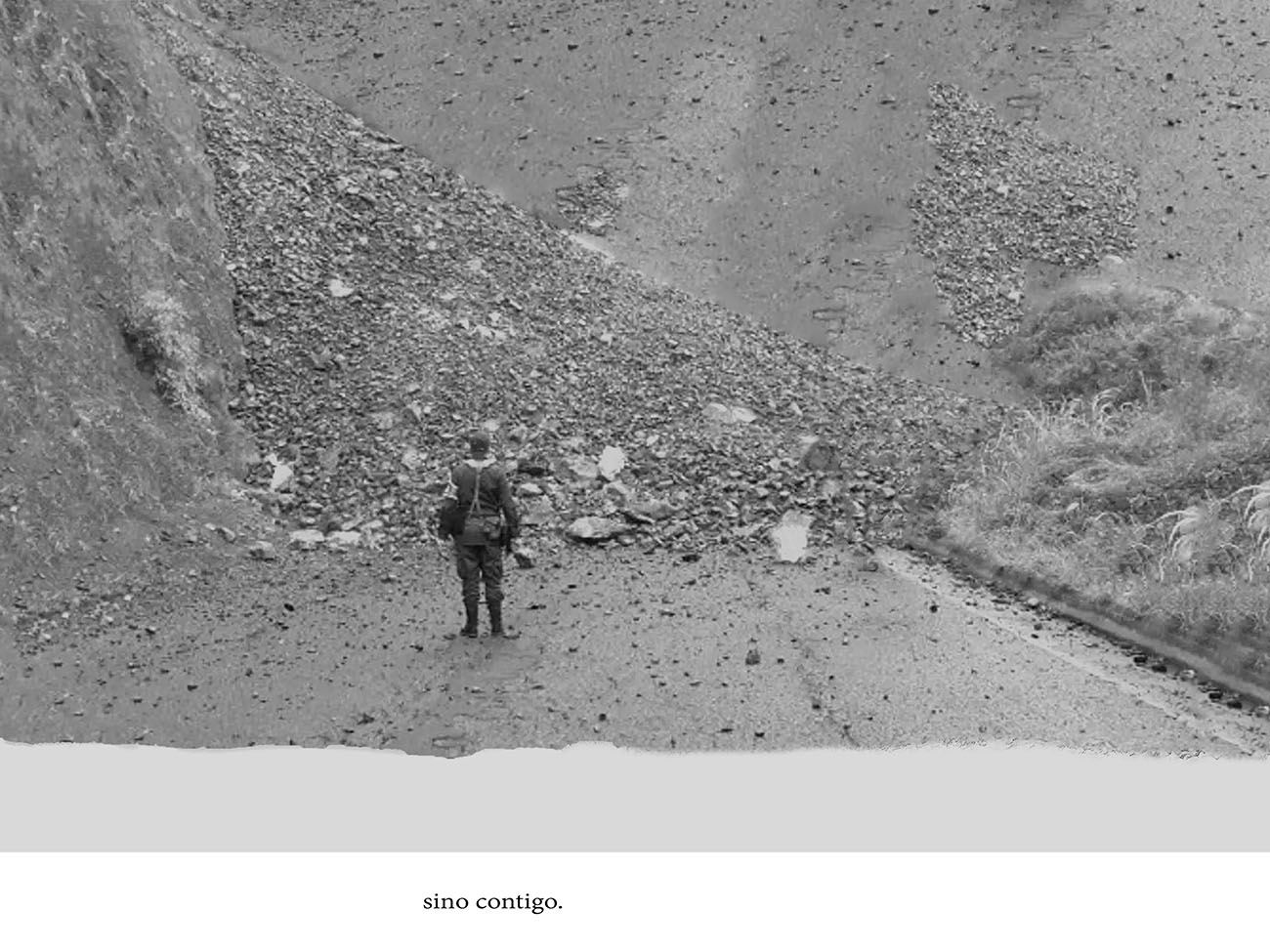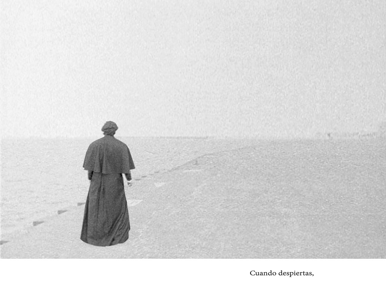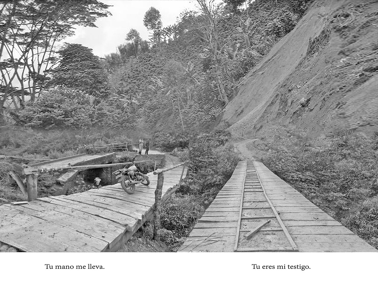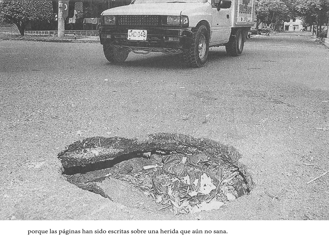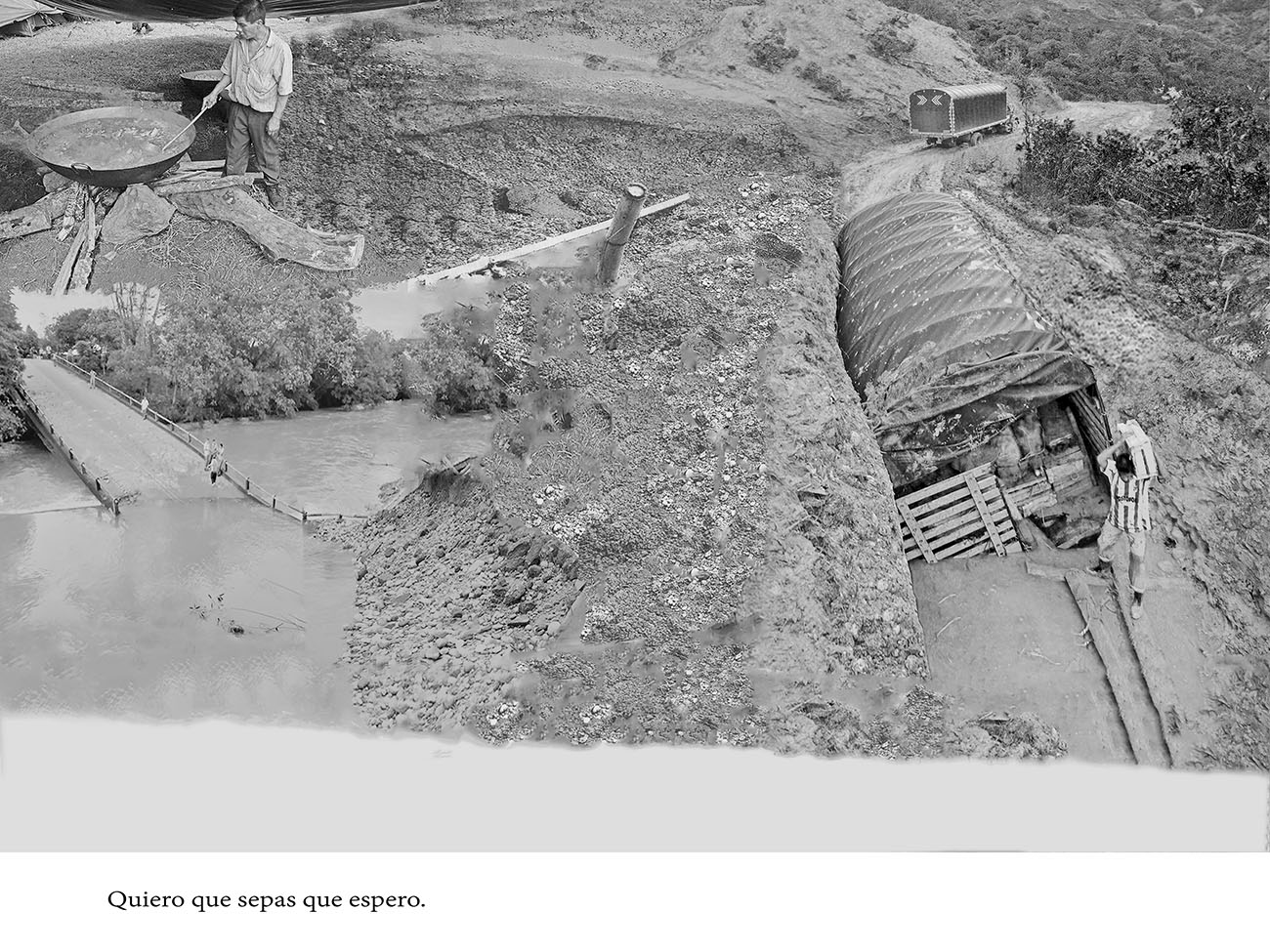 En cuanto a los textos que acompañan las imágenes se trata de un collage y adaptación de de textos de Jorge Luis Borges (His end and his beginning y Un teólogo en la muerte) y de Adrien Heathfield (End time now). Algunas imágenes del ensayo visual son mías y otras  son collages creados a partir de fotografías de prensa y de revistas colombianas. (Semana, El país, El tiempo y El Espectador). El texto en su primera parte tiene connotaciones metafísicas bastante tradicionales dirigiéndose a un otro ausente, es decir, a aquellos que ya no están con nosotros, a los que redime compasivamente en la antigua visión de una vida después de la muerte. Luego el texto duda su trayectoria y corrige el rumbo hacia la segunda parte que toma una forma epistolar dirigida a la figura de un otro, que vive en este tiempo y en el presente, es decir a los vivos. Así que creo que el texto oscila entre la elegía propia de invocar y lamentar a los que perdimos, y al mismo tiempo hacia el deseo de invocación de una esperanza hacia lo que aún no se manifiesta. Esta voz en off, tal como en la convención cinematográfica, es una voz sin cuerpo, una conciencia flotante que imagina situaciones y propone sus visiones al lector dirigiéndose de alguna manera a aquellos que representan las imágenes. Solo que esta voz en off solo tiene lugar en la mente del lector.